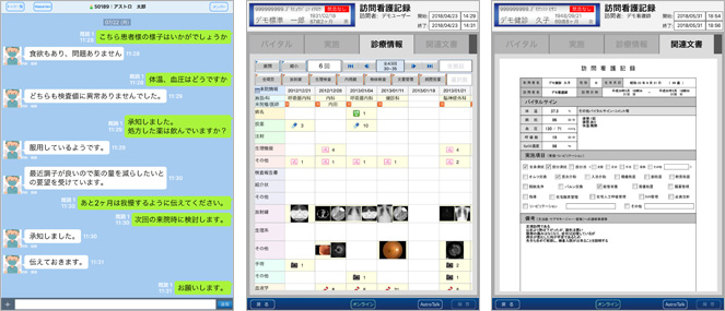 SNSツールで患者ごとに情報連絡用のメッセージ機能を実装しています。 各担当者への連絡から、訪問状況報告、指示確認などタブレットで簡単にやり取りできます。 また画像や看護記録情報なども送ることが可能です。
