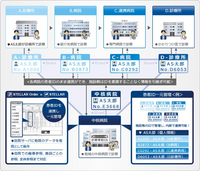 STELLARでは、複数の病院で異なるIDを連携できます。各施設の患者IDはそのままに、システム上では患者ID同士をリンクし 統合化します。サーバは同一でも複数の施設データとして保存が行えることにより、地域連携や関連病院間においても患者IDの連携が 行えます。
