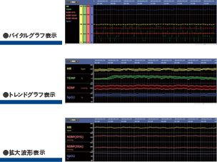 基本のバイタルグラフ表示のほかに、 単位時間中の最大値と最小値を時系列で表示するトレンドグラフ表示、 選択された項目のグラフを拡大して表示する拡大波形表示を用意しています。