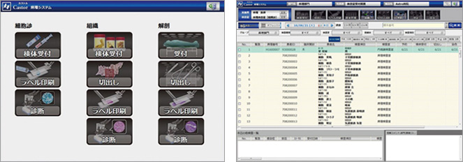 Castor(カストル)は各予約受付から各種の組織診、細胞診、解剖の進捗状況を リアルタイムに表示する病理システムです。 受付一覧および既往歴、病例検索、標本管理、貸出機能まで実装し、標本切出しからスクリーニング、 診断までの一覧がシステム上で管理できます。