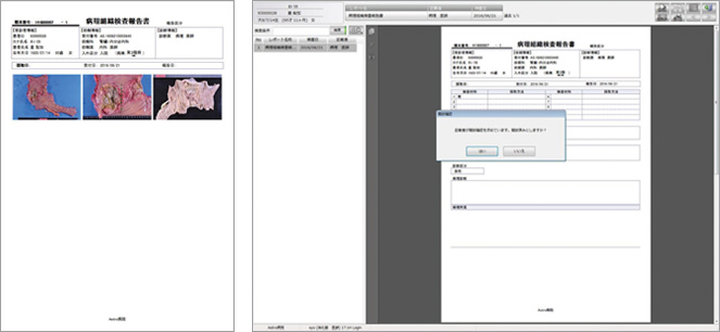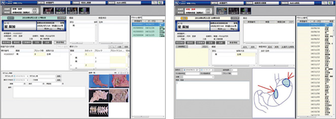 病理検査管理では、組織診、細胞診、解剖の検体受付から切り出し、ラベル印刷、 診断までに一連の作業を管理することができます。進捗状況は検体毎に部門受付リストで確認することが可能です。