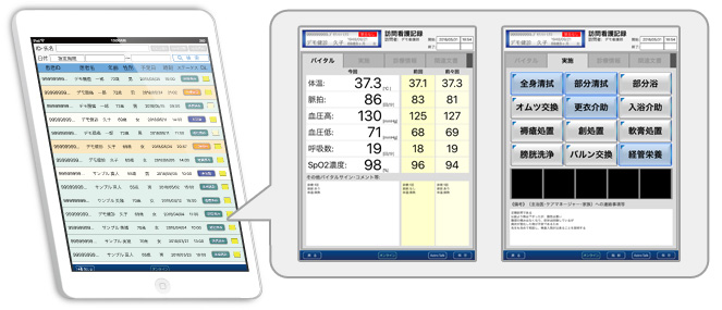 タブレットによる記録入力をサポートしています。 画面タッチでのバイタル入力、看護実施内容、指示内容の参照、状態撮影などまで一連の入力をサポートしています。 登録時には過去記録、簡易コピー、状態の撮影なども行えます。