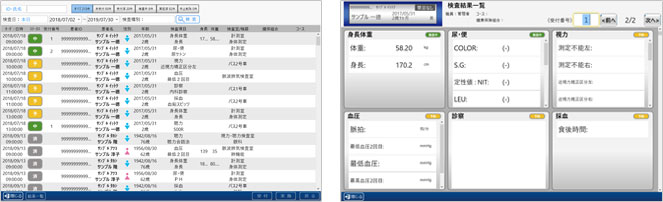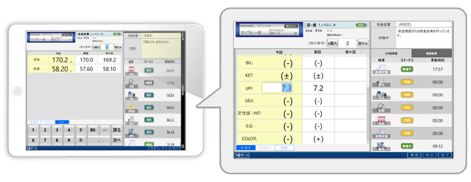 タブレットでの入力ができるので、院内健診と同じ操作性で入力や収集が可能です。 また進行状況、過去結果、前回コメント、機器の待ち数などまで情報を持ち、それらを無線で連携させます。
