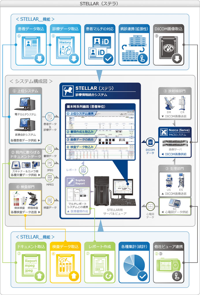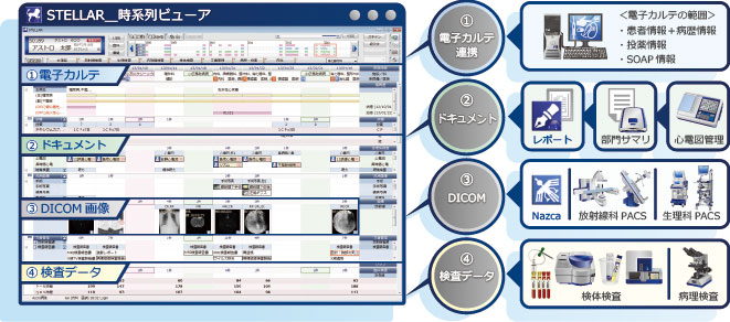 STELLAR(ステラ)は、従来の部門ごとの単体システムから拡張された、 各部門システムを統合する診療データ統合管理システムです。 レセコンや電子カルテより各種の診療データや文章データを受信、 更に放射線科のDICOM画像を オリジナルPACSシステム/Nazca(ナスカ)に格納、 またその他生理部門の各種検査データ等もシステムに登録できます。 それら全てのデータを患者ごとに1画面上に時系列で一括表示することにより、 各部門検査の相対関係も把握可能になります。