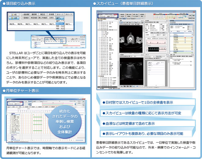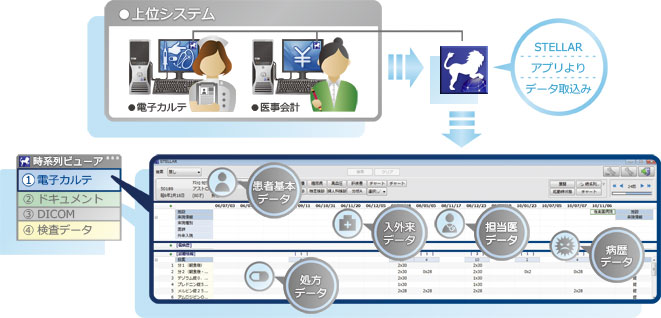STELLARは既存システムの発想を超え、部門データを統合的に管理できる画期的なシステムです。 基本表示は時系列でリアルタイムに診療データや文章データ、放射線科から検査科のデータまで統合的に管理できます。