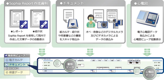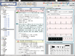 また、紙ベースの紹介状などスキャナで取込んだ文章データ、 オペや救急時にデジタルカメラで撮影された画像データ、MPEGやAVIなどの 動画データもドラッグ&ドロップで自由に張付けが可能です。 その上、表示が難しいとされる心電図データも、他社製の電子心電図ビューアと 連携して時系列に表示します。