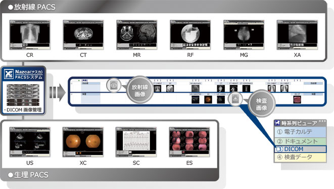 DICOM画像はアストロステージ・オリジナルPACSシステム『Nazca』に 格納し、患者ごとの時系列画面上に表示します。 放射線部門のCR、CT、MRなどの静止画DICOMデータとアンギオなどの動画DICOMデータから、 生理検査部門のエコー、内視鏡、眼底などのDICOM/JPEGデータを含む 全てのモダリティDICOM画像を、部門の隔てなく時系列上に表示可能にします。