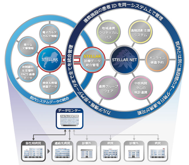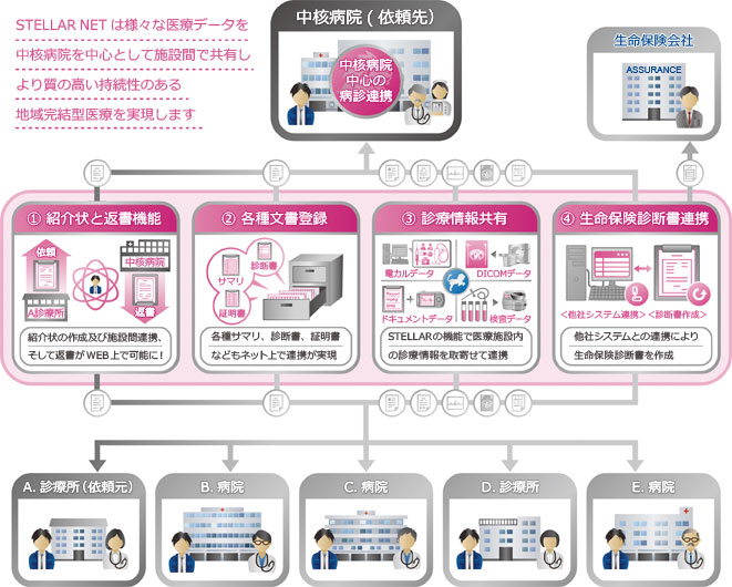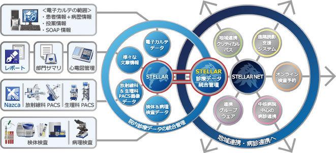 病診連携システム「STELLAR NET」は、院内の診療情報の共有から地域での 共有化までを実現します。 地域連携パスと遠隔読影への対応、そして検査予約システムの実装まで行え、単なるWEB参照だけではなく具体的な地域連携が 行えるシステムです。また、個別メーカーに依存することなく、シームレスに診療情報の連携が図れます。