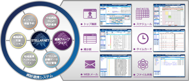 「STELLAR NET」は、効率的なポータルサイトとしての機能を有しています。 トップページの機能表示はユーザ毎に変更でき、グループウェア として 掲示板 や グループWEBメール、 スケジュール管理、時間管理、 ファイル共有 などの機能を実装していて、 グループ内の情報交換を円滑にします。院内配信用の伝聞機能や連絡先を登録する事により グループでの情報共有や医療連携が可能となります。