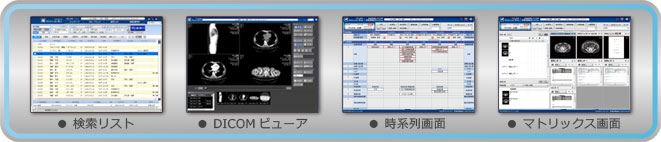 診療情報共有システム「STELLAR」と連携させ、院内の全診療データ (電子カルテ情報+各部門データ)を統合。 そして「STELLAR NET」の機能により、収集データを基とした地域の病院間や診療所とのオーダ連携へと発展させます。 更に、画像を含め全ての診療データをWEB上で閲覧でき、表示方法も リアルタイムDICOMビューア から 時系列表示 や マトリックス表示 と 用途に合せた仕様が可能です。