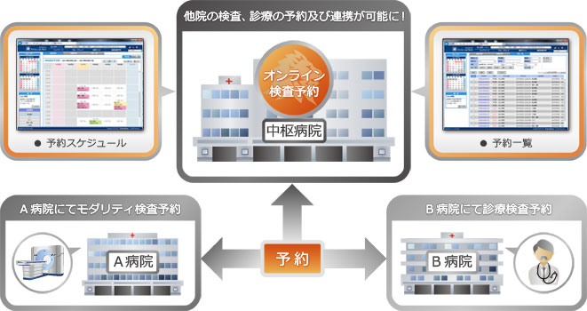 検査予約がネット上でそのまま入力及び連携できます。 WEB上で 機器予約・診療予約 を行えるので、どこからでも機器の予約状況の確認を行えます。また、検査機器の公開枠を設定することにより、 提携先の他の病院からも直接予約が行え、リアルタイムに結果が分かり、電話による確認の手間が省けます。
